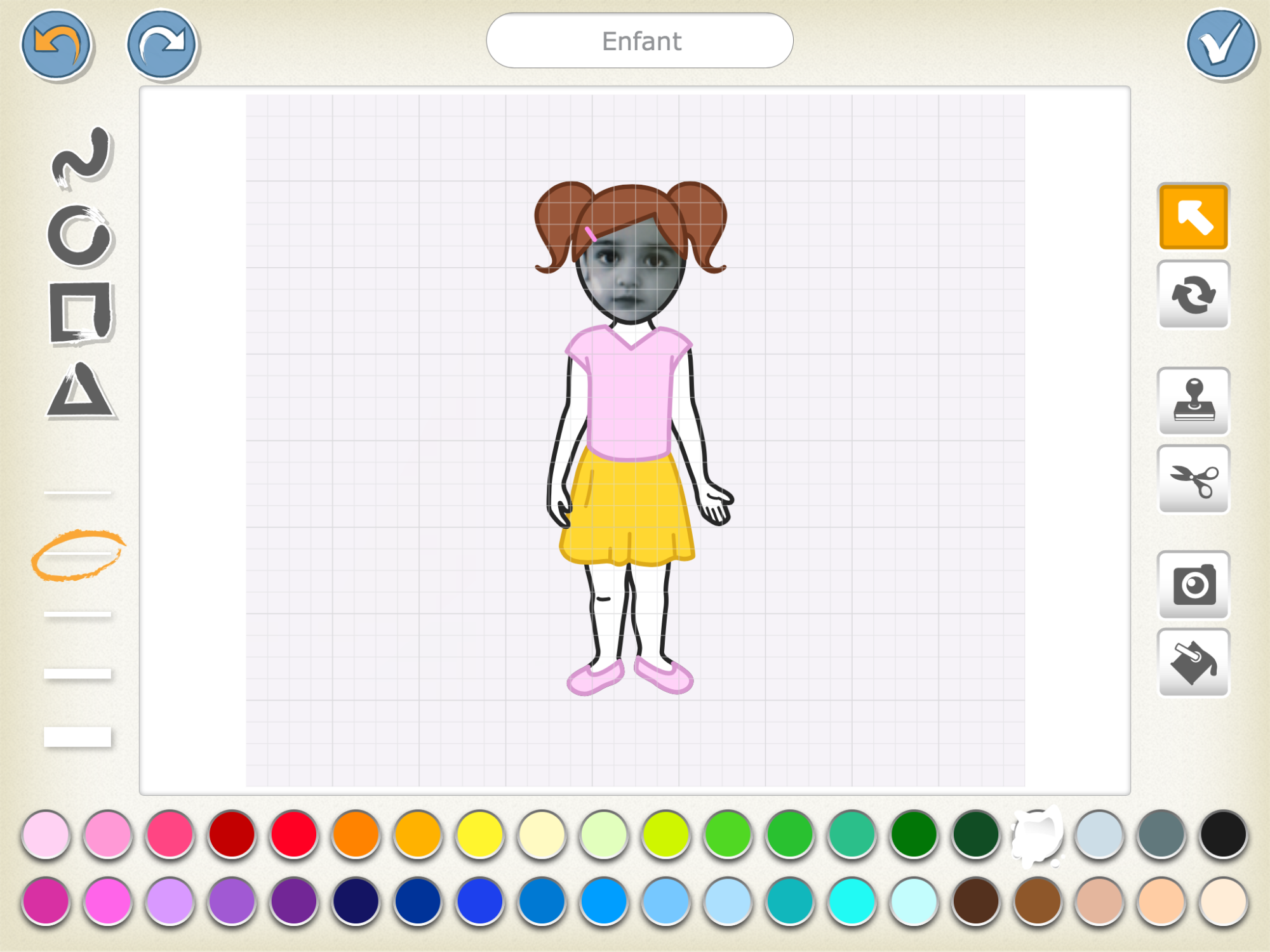 Photo : Permet d'insérer une photo dans un objet ou une forme. Lorsque cette icône est activée, touchez une forme ou une partie d'un personnage pour y insérer une photo (voir ci dessous insérer une photo).
