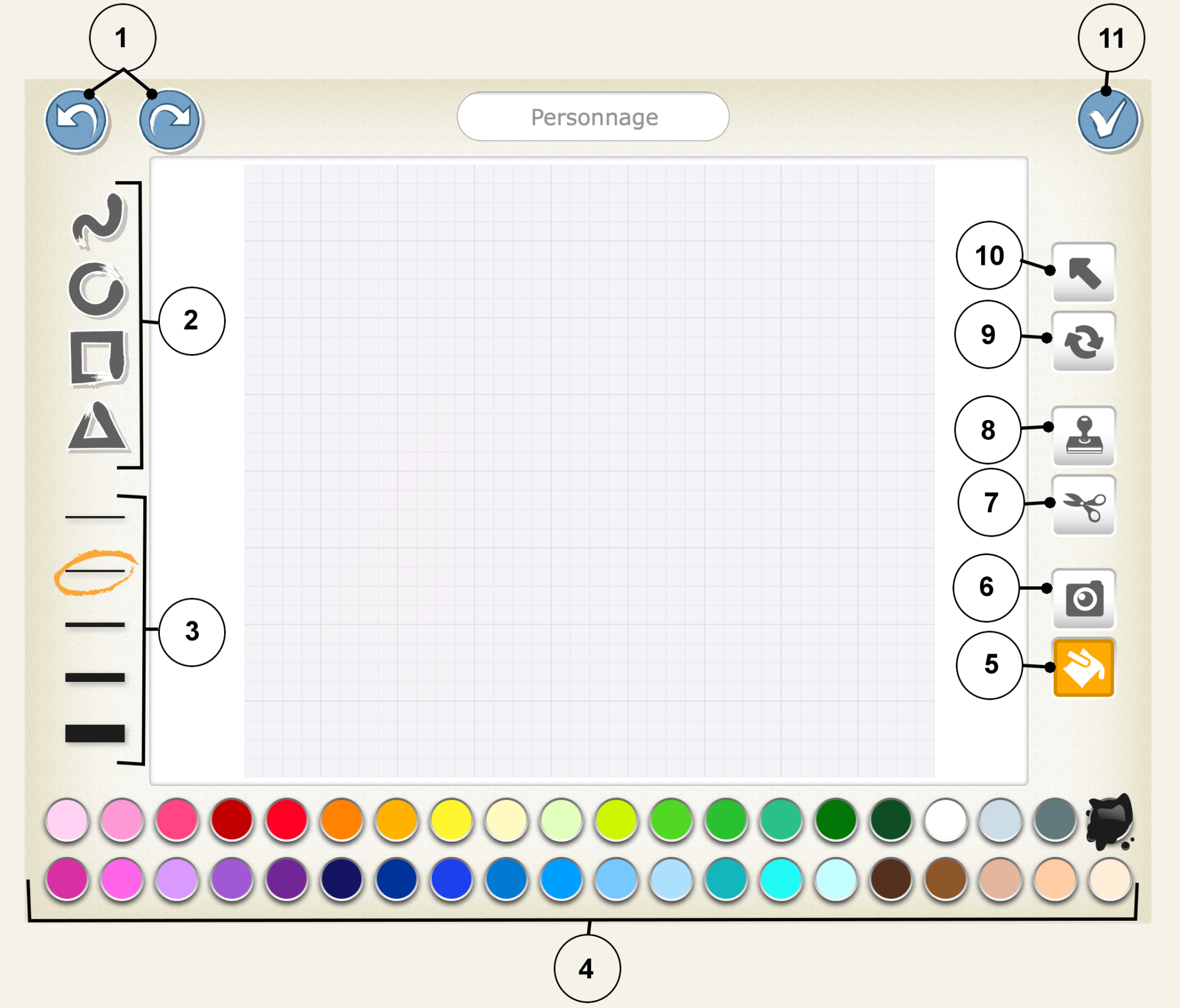 Palette de couleurs : Permet de choisir les couleurs de tracé et de remplissage parmi les 40 couleurs disponibles. Lorsque vous sélectionnez une couleur les traits d'épaisseurs différentes (3) se colorent avec la couleur choisie ce qui permet de tracer des formes avec la couleur de son choix.