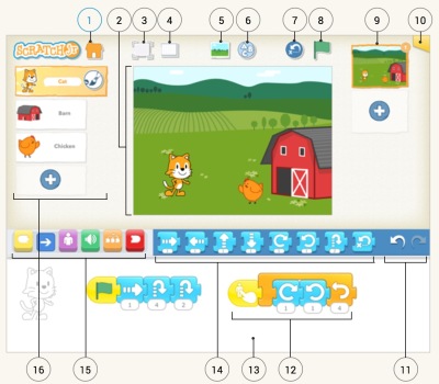 Voici l'interface de création de ScratchJr. cette interface regroupe toutes les commandes nécessaires à l'animation des sprites. Elle se compose de quatre parties principales. Les icones sont expliquées ci-dessous.