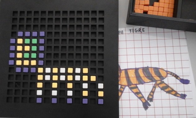 Les élèves étaient amenés à reproduire des formes sur un quadrillage en utilisant des cubes de couleurs. Le principe étant le même que Bloxels, cela leur a permis de se familiariser avec le principe de reproduction, de dénombrement des cubes.