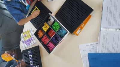 Une fois le dessin reproduit sur le plateau, les élèves ont photographié leur création via l'application sur tablette. Il devaient ensuite vérifier l'exactitude terme à terme des cubes.
