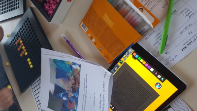 Comme dans la séance 2, les élèves devaient créer sur papier, reproduire sur le plateau de jeu et transformer leur création dans l'application Bloxels.