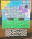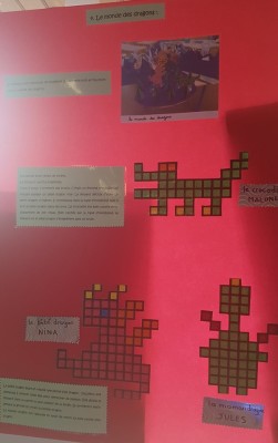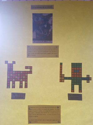 Une fois le dessin réalisé, on y a superposé des feuilles transparentes quadrillées à l'identique du quadrillage Bloxels. Les élèves devaient observer les lignes, repérer les cases colorées, repérer les dites cases sur le quadrillage du plateau Bloxels et y positionner un cube.