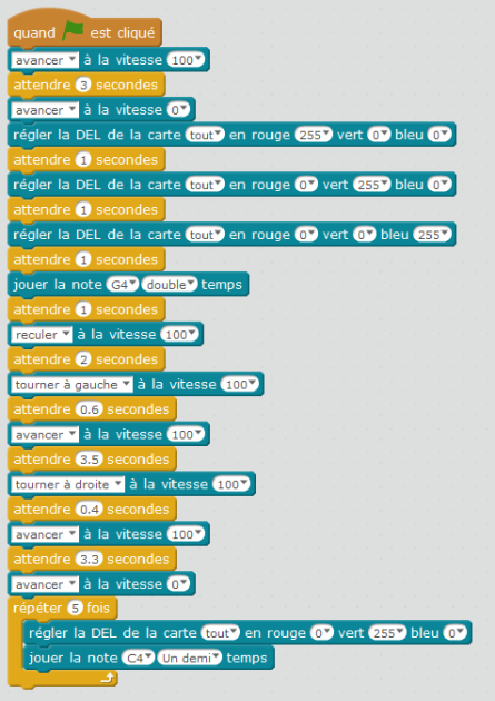 3/ Une fois arrivé, il émet un son 5 fois tout en allumant ses leds en vert "de joie..." : l'histoire est terminée tout comme le programme.