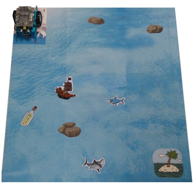 2/ Il fait marche arrière et trouve un chemin pour aller sur l'île de Robinson en évitant les pirates, requins et récifs.