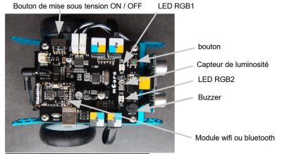 capteurs : kit pare-chocs, 4 boutons-poussoirs, tactile, joystick, potentiomètre rotatif, lumière, présence, température / humidité, gaz, flamme, son, boussole, angulaire 3 axes ;