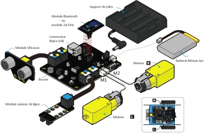 Il est constitué d'un châssis robuste en aluminium équipé de deux motoréducteurs et d'une carte de pilotage (arduino). Il peut détecter des obstacles, suivre une ligne, émettre des sons et des signaux lumineux, recevoir des ordres d'une télécommande, communiquer par un canal infrarouge avec un autre robot...