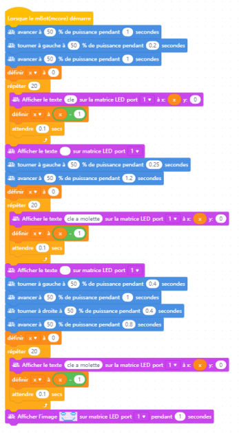 Il faudra poursuivre et modifier le programme précédent pour qu'à chaque fois que le robot rencontre un outil, il affiche le nom de l'outil sur l'écran LED (le nom devra défiler de droite à gauche car certains noms sont trop longs. A la fin, il devra afficher un visage souriant.