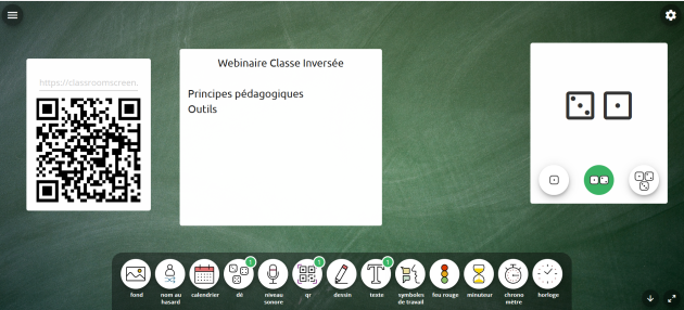 personnalisation du fond d'écran, calendrier, affichage QR, insertion texte ou dessin, minuteur, chrono, lancer des dés, choix d'un nom d'élève au hasard ...